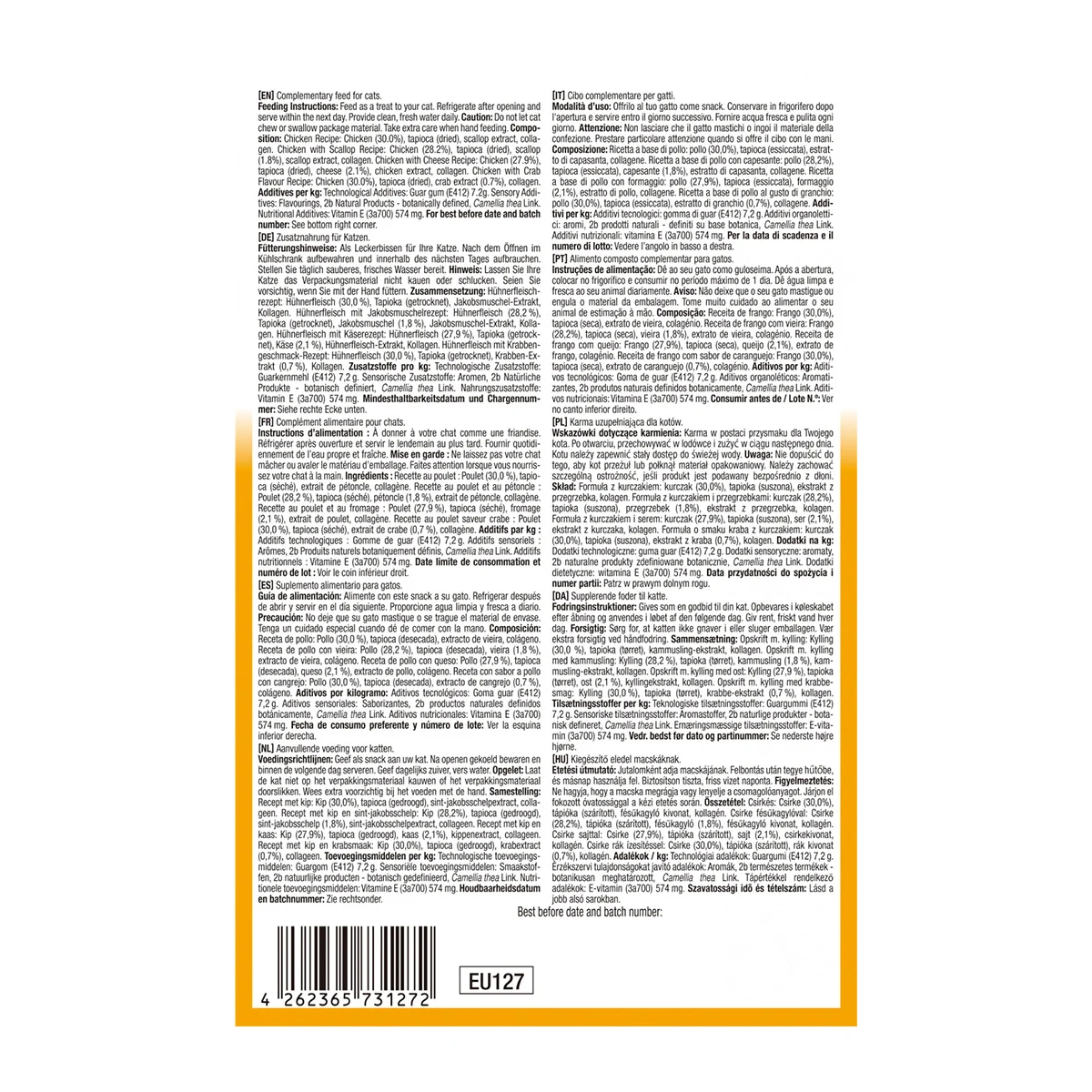 Instructiuni de hranire: Dati-o pisicii dvs. ca gustare. Pastrati la frigider dupa deschidere si serviti cel tarziu a doua zi. Puneti zilnic la dispozitie apa curata si proaspata. Precautii: Nu lasati pisica sa mestece sau sa inghita materialul de ambalare. Acordati atentie sporita cand hraniti din mana.