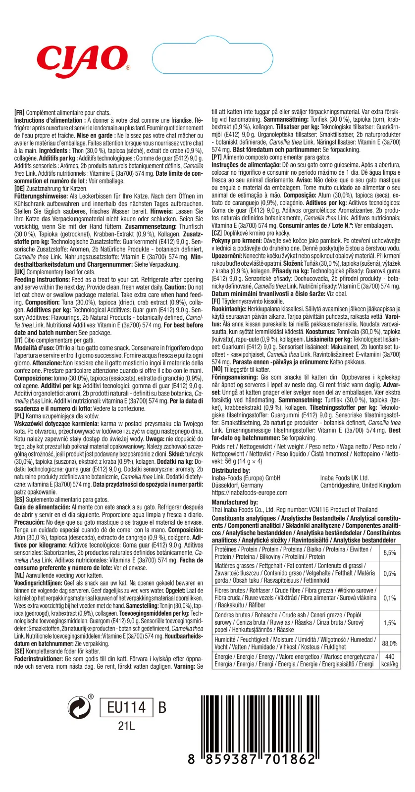 Compozitie: Ton (30,0%), tapioca (uscata), extract de crab (0,9%), colagen. Aditivi la 1 kg: Aditivi tehnologici: Guma de guar (E412) 9,0g. Aditivi senzoriali: Arome, Produse naturale 2b – definite botanic, Camellia thea Link. Aditivi nutriţionali: – Vitamina E (3a700) 574 mg.