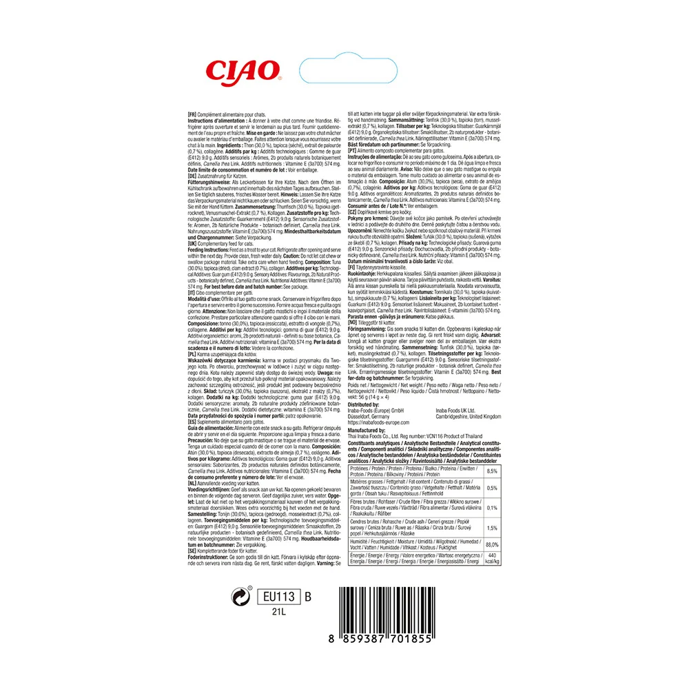 Precautii: Nu lasati pisica sa mestece sau sa înghita materialul de ambalare. Acordati atentie sporita când hraniti din mâna. Compozitie: Ton (30,0%), tapioca (uscata), extract de scoici vongole (0,7%), colagen. Aditivi la 1 kg: Aditivi tehnologici: Guma de guar (E412) 9,0g. Aditivi senzoriali: Arome, Produse naturale 2b – definite botanic, Camellia thea Link. Aditivi nutriţionali: – Vitamina E (3a700) 574 mg.