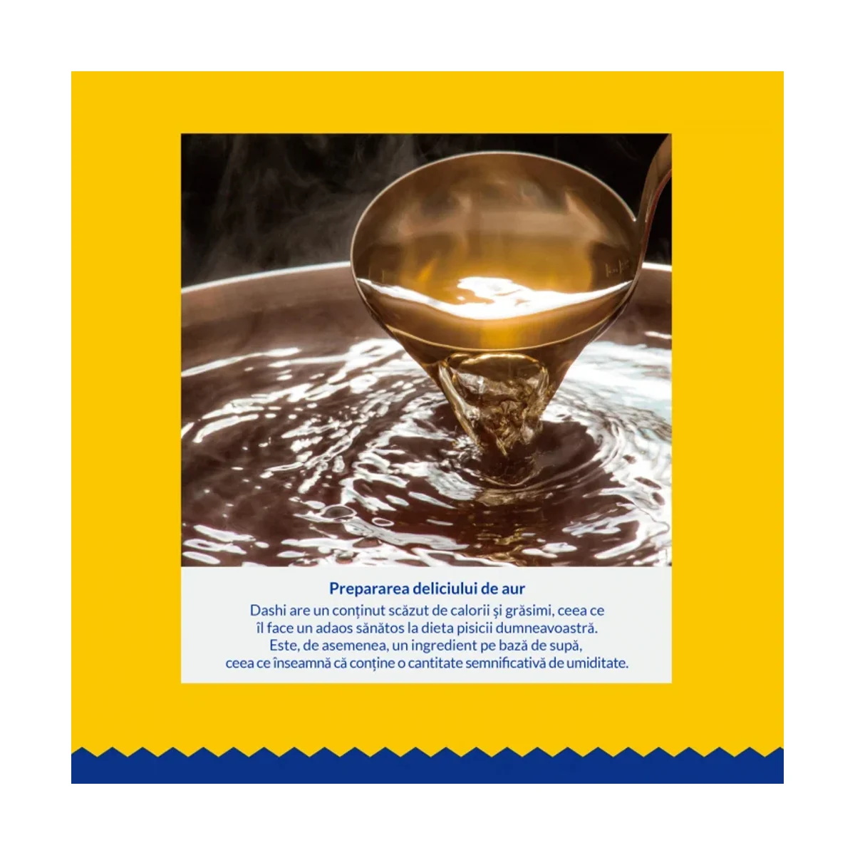 Dashi este un bulion traditional japonez, realizat din fulgi de ton uscat (bonito flakes), renumit pentru aroma sa bogata si savuroasa (umami). Este natural sarac in grasimi si calorii, facându-l o completare sanatoasa pentru dieta zilnica a pisicii.