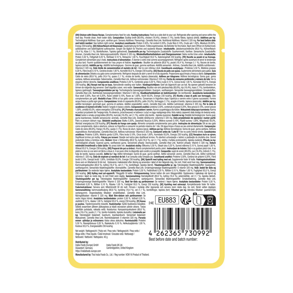 Combinatia de pui (16.8%) si branza (1.1%) ofera o sursa gustoasa si hranitoare de proteine usor digerabile, pe placul celor mai pretentioase feline.