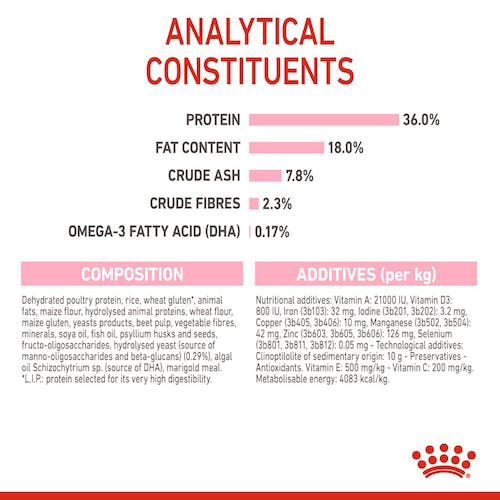 COMPOZIŢIE: proteine de carne de pasăre deshidratată, orez, gluten de grâu*, grăsimi animale, făină de porumb, proteine animale hidrolizate, făină de grâu, gluten de porumb, produse din drojdii, pulpă de sfeclă, fibre vegetale, săruri minerale, ulei de soia, ulei de peşte, tegumente şi seminţe de psyllium, fructo-oligozaharide, drojdie hidrolizată (sursă de mano-oligo-zaharide şi beta glucani) (0,29%), ulei de alge Schizochytrium sp. (sursă de DHA), făină din crăiţe.