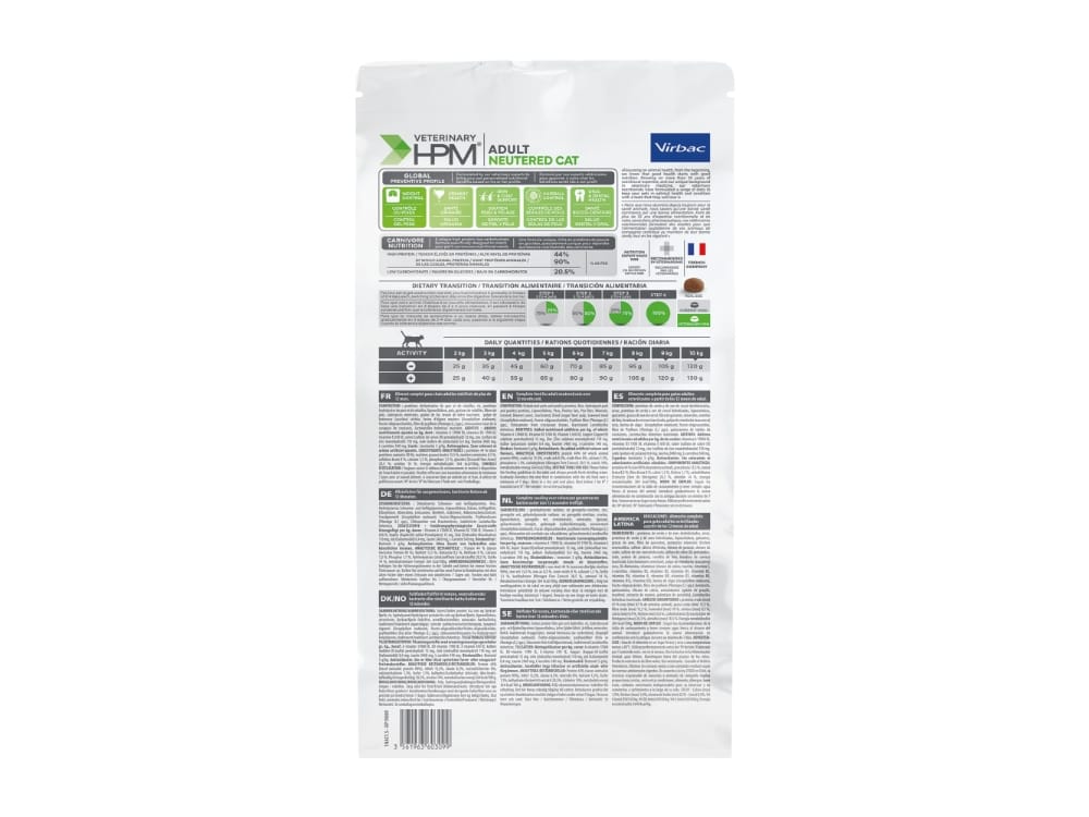 Gama fiziologica Veterinary HPM respecta nevoile carnivorelor prin compozitia HP-LC (high protein – low carb) cu nivel scazut de carbohidrati si nivel ridicat de proteine. Astfel, HPM Adult neutered cat contine 18% carbohidrati si 44% proteine, din care 90% de origine animala.